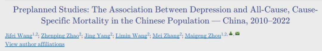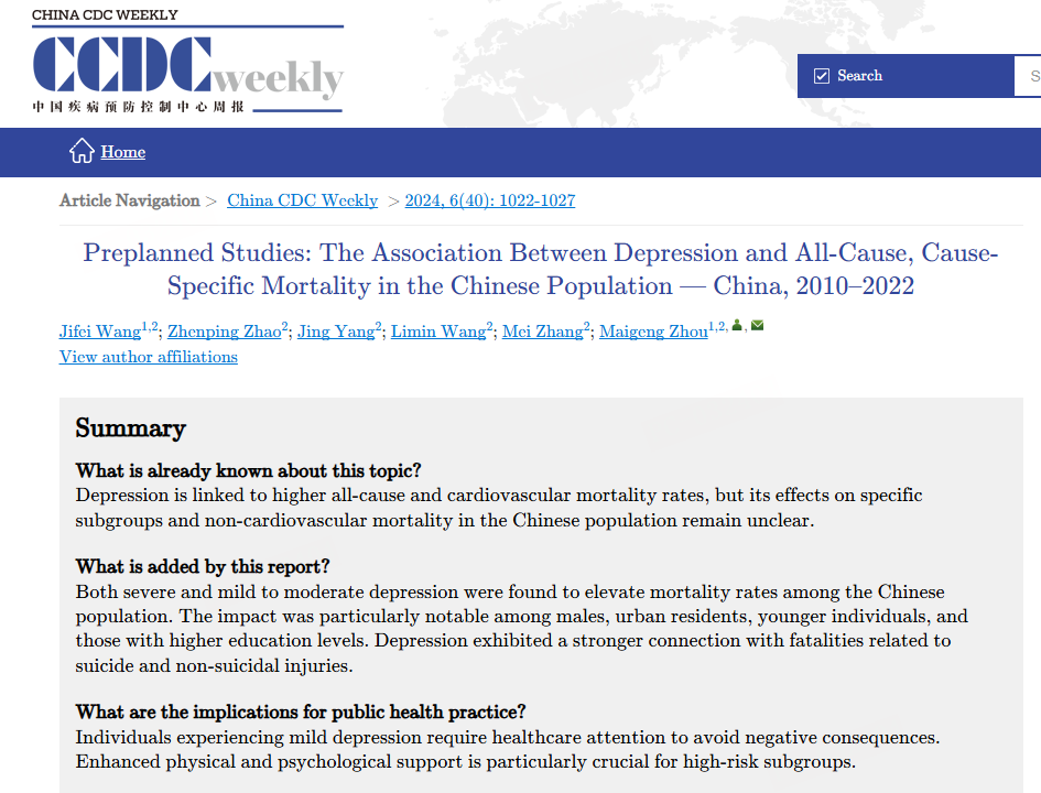 抑郁症是影响全球人口的紧迫全球健康问题。截至 2015 年,全球受影响的人数已达到 3.2 亿,患病率为 4.4%。尽管世界各地的研究都将抑郁症与死亡率上升联系起来,但专门针对中国的证据有限。近日,中疾控发文报道了一些研究发现,重度和轻度至中度抑郁症都会提高中国人口的死亡率。这种影响在男性、城市居民、年轻人和受教育程度较高的人群中尤为明显。抑郁症与自杀和非自杀性伤害相关的死亡有更密切的联系。该文题为“Preplanned Studies: The Association Between Depression and All-Cause, Cause-Specific Mortality in the Chinese Population — China, 2010–2022”。