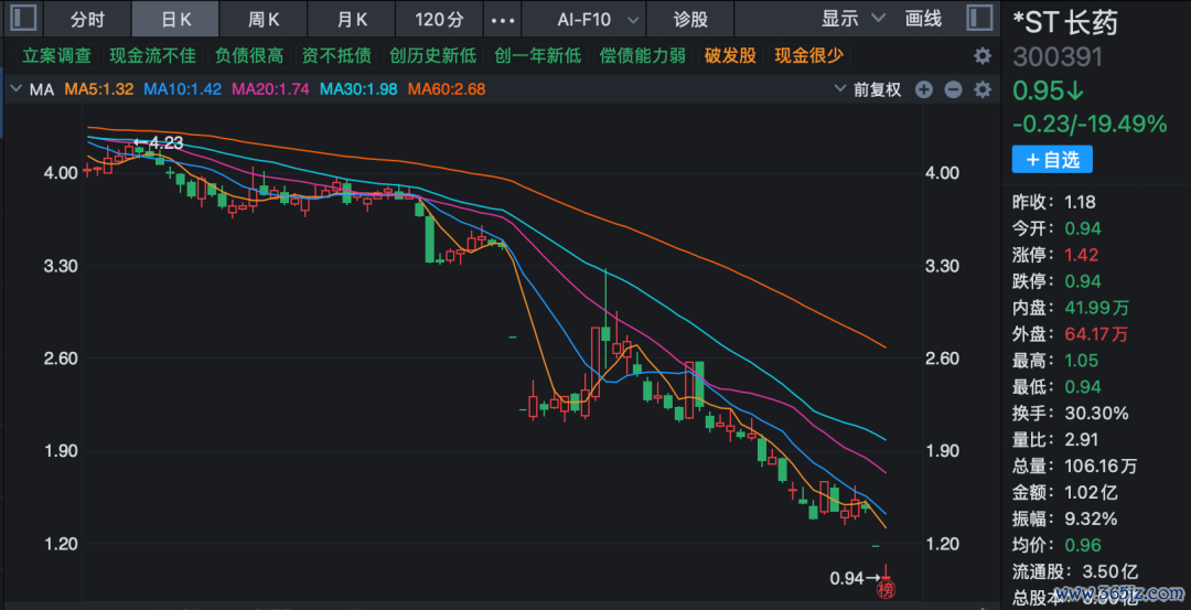 正是在该信息披露后,*ST长药股价出现一字跌停,27日大幅下跌19.73%,收盘价为1.18元/股,今日再次大幅下跌19.49%诚信配资,收盘价为0.95元 /股 。